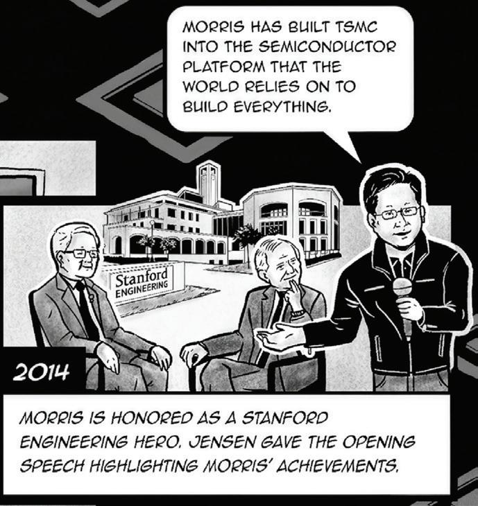Their collaboration began when Huang wrote to Chang in the early 1990s and received a direct call back that sealed their early partnership. TSMC manufactured Nvidia’s first successful chips, and a lasting friendship took root. On visits to TSMC, Huang admired the company’s emphasis on “trust and integrity.” Chang visited Nvidia’s Sunnyvale campus in 2001, deepening their mutual respect. That year, Huang honored Chang on his 70th birthday as “a wise explorer.” Later, Chang and his wife, Sophie, celebrated Huang’s 50th birthday with personal gifts in Taiwan. In 2014, when Chang was honored as a Stanford Engineering “Hero” in the Nvidia Auditorium at the Jen-Hsun Huang Engineering Center, Huang was there to share personal remarks highlighting Chang’s achievements, his enduring values, and his unparalleled impact. Continuing a tradition of shared innovation, TSMC later helped upgrade Stanford’s Nanofabrication Facility. Huang honored his long partnership with Chang by gifting him an artist-rendered timeline of their collaboration and friendship, which now hangs in Morris and Sophie Chang’s Taipei office.