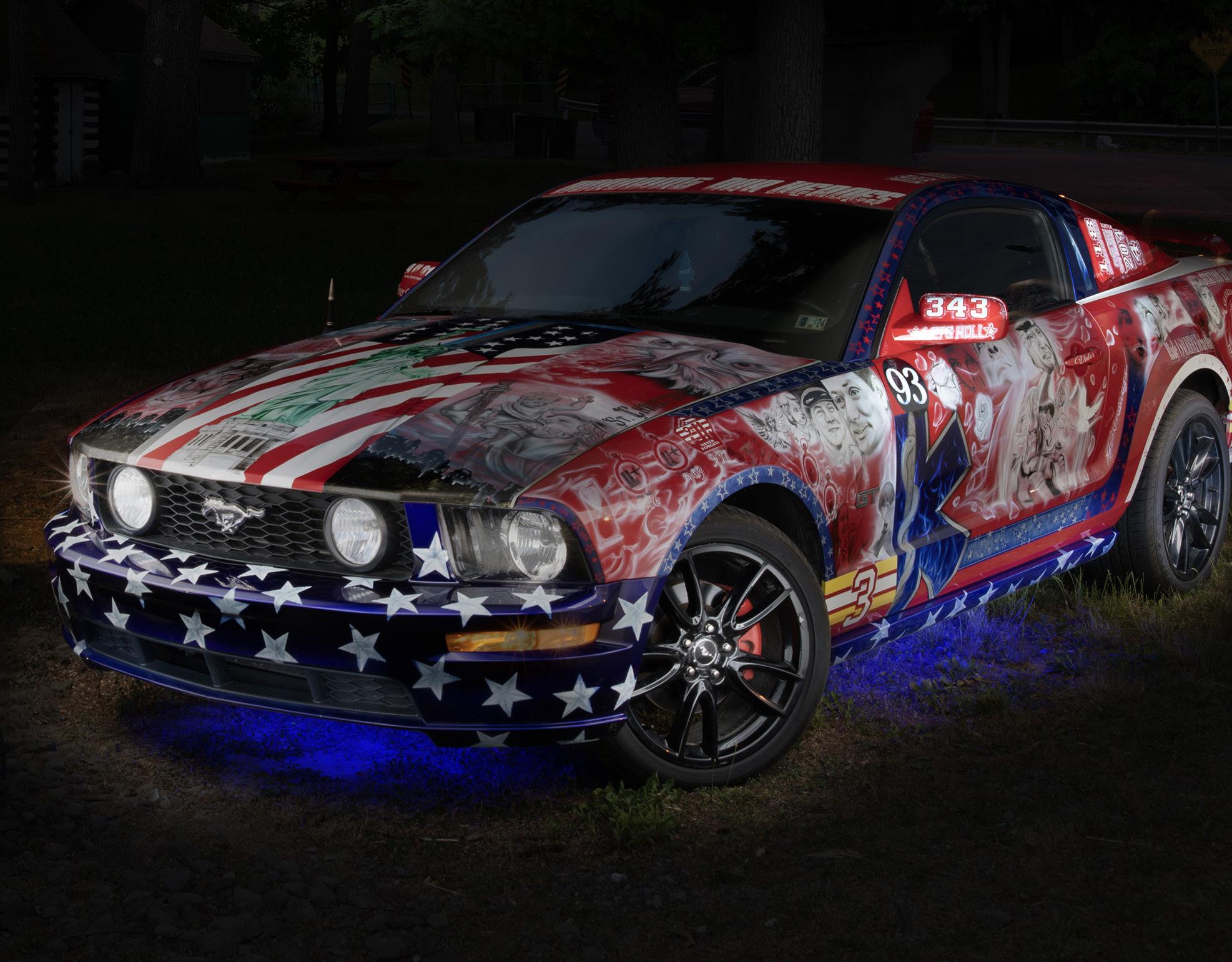 The three of us wanted to build something special for our heroes that died that day. So the 9/11 Tribute was born. I wanted something I loved to built this tribute. Pony power! I love my Mustang so I purchased this 2006 Mustang GT and we took it apart and started to design the tribute. Many hours of looking at pictures from that day took a toll on our artist for it brought back that day each time they looked at a picture. The car was designed in the best way