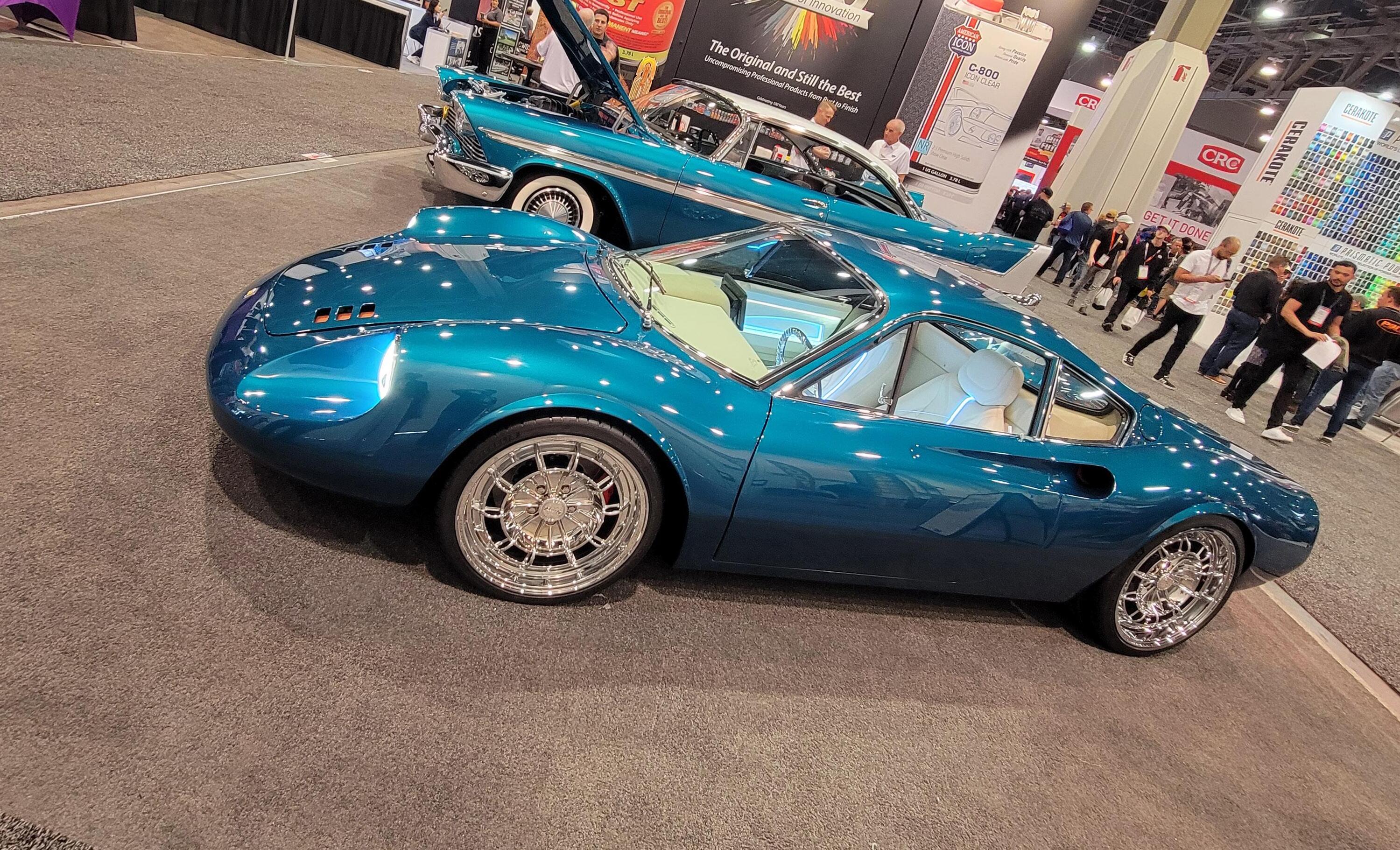 Now for an interesting new build... a 1973 Ferrari Dino EV. This car had a slick light green color to it and was completely rebuilt modernizing it into the future. It had an electric motor providing near 200 miles of range on a single charge. In addition, it had a water cooling plate to optimize proper operating temperatures and for additional protection, the batteries are enclosed in a stainless steel impact absorbing enclosure, take that Elon Bust! What I enjoyed the most about this was the digital gauges which were really retro looking and the interior with Italian leather and green LED light accents. Man this thing looked hot I am telling you.