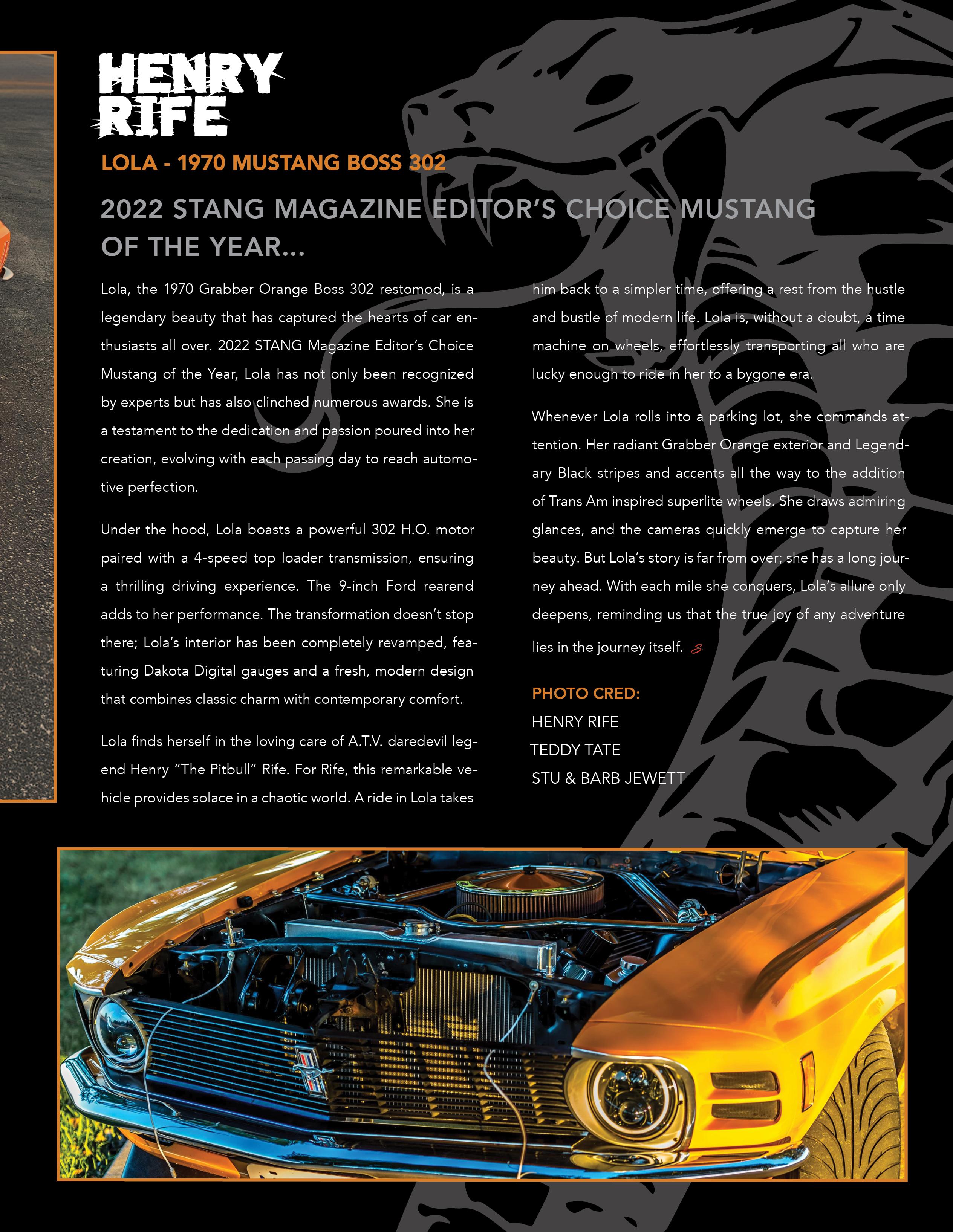In 2022, Mustang enthusiasts took notice. STANG Magazine named Lola their Editor’s Choice Mustang of the Year, cementing her legacy. But for me, the reward isn’t the recognition, it is the ride. The rumble of the engine, the scent of high-octane fuel, the road unfolding like an old familiar song. Thanks to Russ Belt for the mechanical work, she is a rumbling beauty.