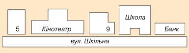 Ситуація. Подивіться на малюнок 1. Ви бачите ескіз вулиці, на якій розташована школа. Сашко сказав, що він вийшов зі школи і пройшов повз три будинки вздовж цієї вулиці.