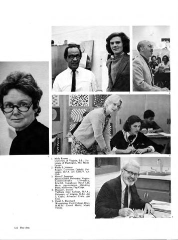 1. Molly Reeves University of Virginia, B.S.; University of Washington, M.S . Medi a Cenrer. 2. Waldo E. Johnson Rutgers University; Catholic University, B.F.A . Art II ,III,IV. Art Club. 3. Elmer F. Sampson 路 James Millikin University; Virginia Commonwealth U nive r sir y, B .M .Ed. Symphonic Band ! ,II; Music Appreciation . Marching Band ; Majorettes; Flag Corps. 4. Donna H . Tucker Vald osta Srare College, B.F.A.; University of Virginia, M.Ed. Art I; Crafts; Advanced Crafts. Art Club. 5. David A. Blanchard Westminisrer Choir College, B.M.; B.M .Ed. Choral Music ; Music Theory.