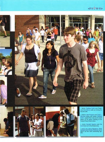 man Nick Brown walk out during the first fire drill. <Juniors Jake Pompeo and Tania L. Sanchez along with senior Carlissa Smith, explain their roles as the bank tellers at the grand opening of the Patriot Pride Credit Union. < Junior Kendall Hawkins and Kia Scott hed out to the Breezeway. < Irene Lee, Alana Meadows, Peter Garland and Charles Robinson try to figure out the new scheduling system.