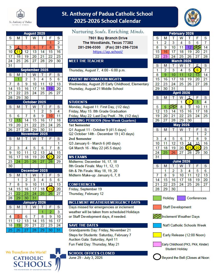 We are looking forward to working with you and your child this school year. This year we are focusing on celebrating our 25th year as a school! As we celebrate our 25th anniversary as a school, we are grounding this milestone in the words of our patron, St. Anthony of Padua “The life of the body is the soul, the life of the soul is Christ.”