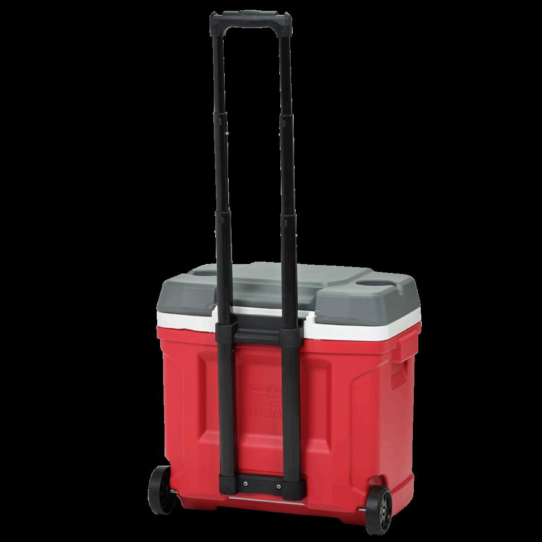 30-quart rolling cooler. 43 can capacity and media slot, which allows you to place your cell phone or other electronics on the lid for playing music. 13.5” L x 17” W x 17” H. Imprint. Import.
