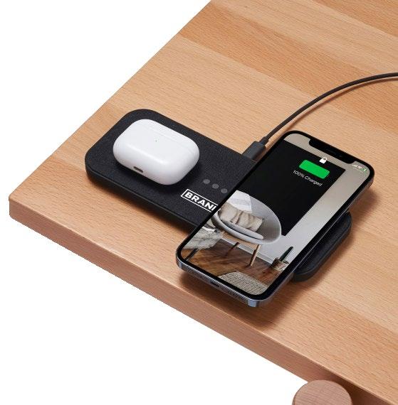 Style #: MOQ: MSRP: $61.82 12 PP22102 Transport your all-in-one office anywhere! The fully equipped desk pad includes: laptop/tablet/book stand, bamboo wireless charger 10W and bamboo pen/card organizer. Easy tri-fold setup. Magnets hold bamboo in place. Antibacterial material, RPET. Fits most 17" laptops. Auburn Tri Fold Wireless Desk Pad