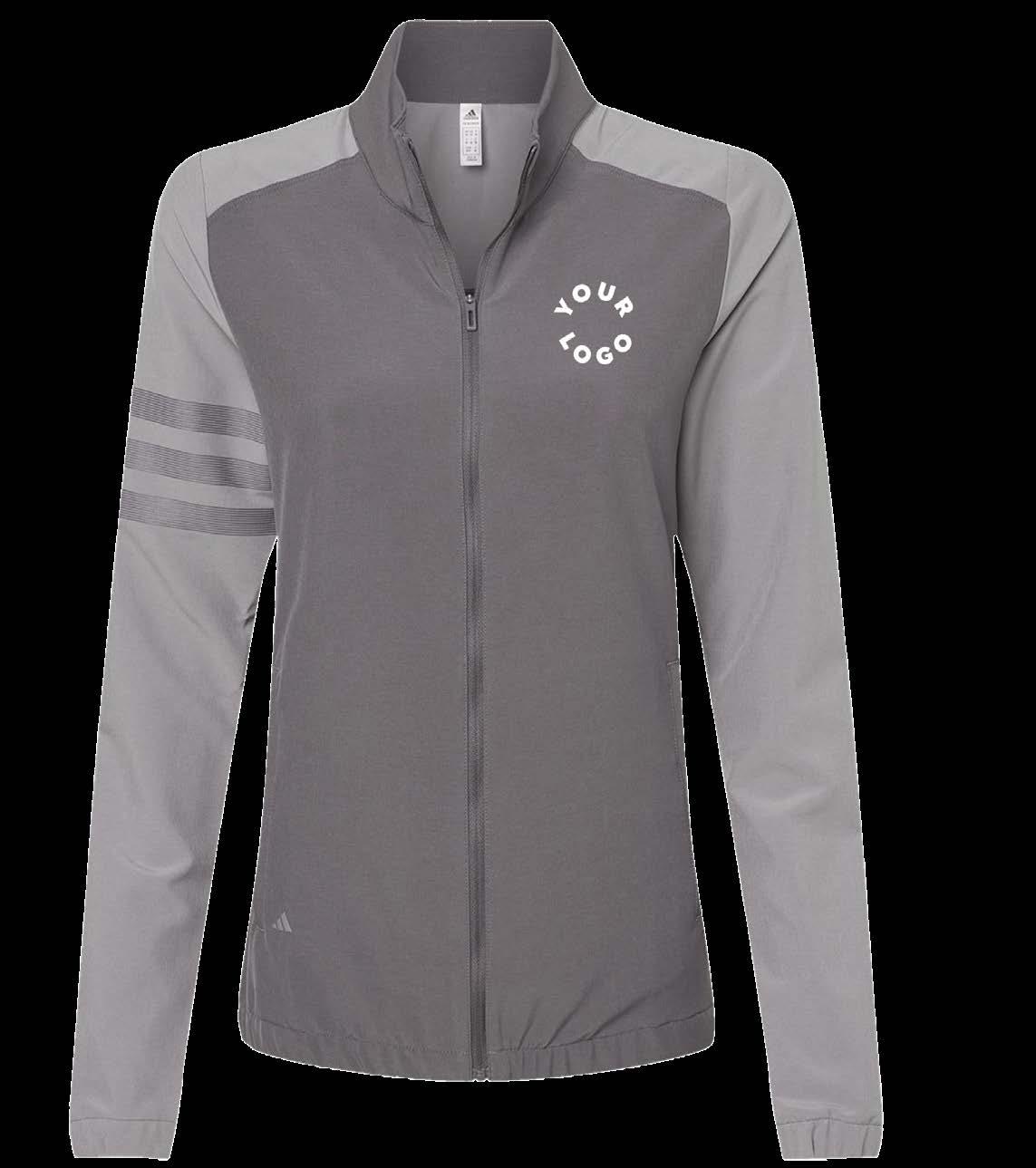 94/6 recycled polyester/elastane plain weave, Durable water-repellent finish, Soft shell stretch fabric, Half elastic cuffs, Two front zip pockets, 3-stripes on right arm, Contrast color adidas performance logo on back neck