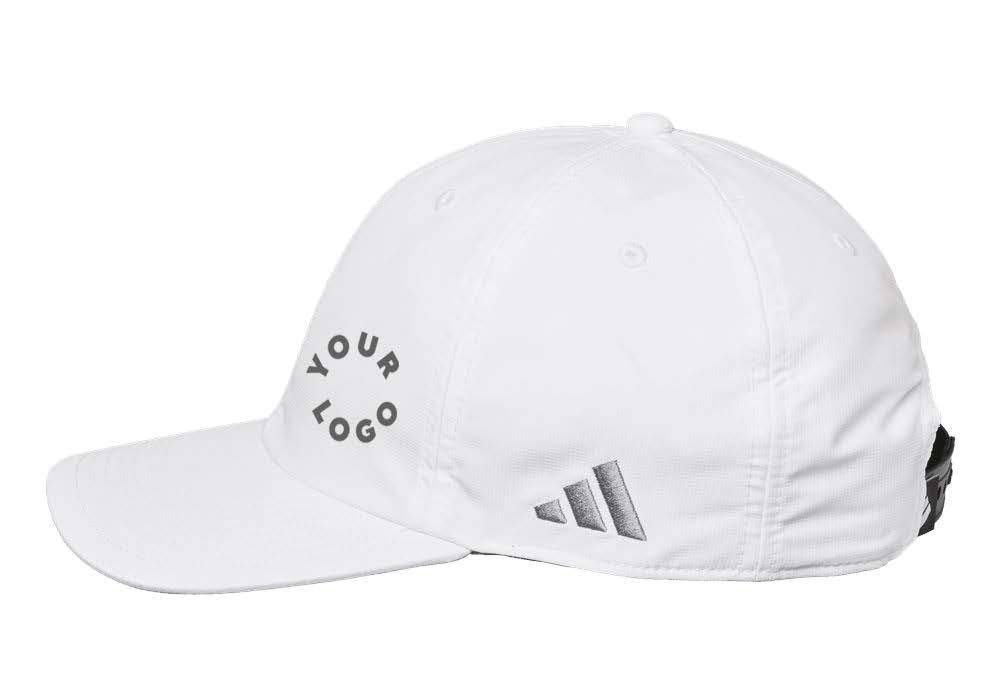 100% recycled polyester moisture-management performance fabric, structured, six-panel, mid-profile pre-curved visor, moisture-management sweatband, UV protection of 50+ UPF, embroidered adidas logo on left side panel, black snapback closure with adidas woven label, navy has a navy closure.