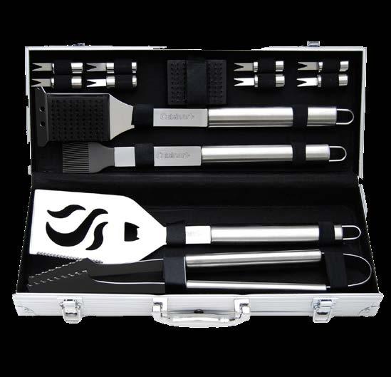 This durable set of stainless steel tools includes a Chef's Spatula, Grill Tongs, Silicone Basting Brush, Cleaning Brush, Extra Cleaning Brush Head and 4 Pairs of Corn Holders. QTY 8