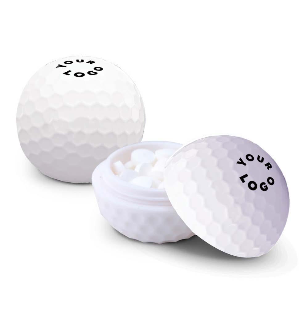 This 1 1/2" x 1 1/4" tin has a realistic looks and a twist-off lid, and is filled with golf ball shaped vanilla mints. It's a great match for golfing events, pro shops, golf courses or as part of an icebreaking welcome package at a convention, trade show or seminar.