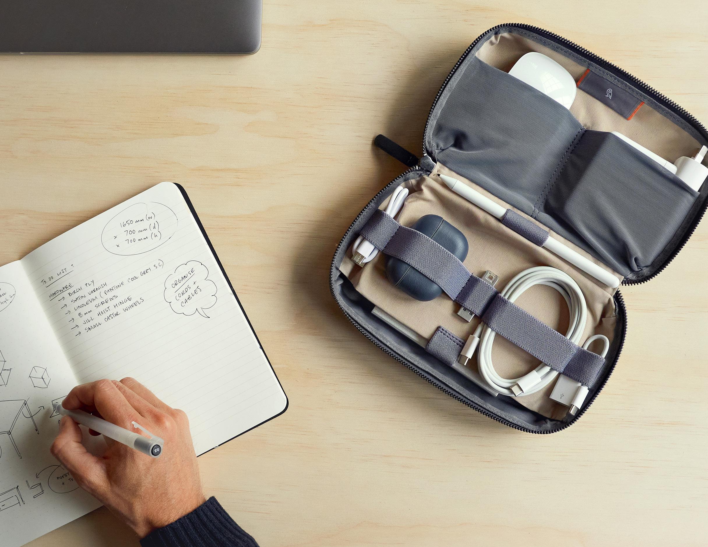 Organize your tech accessories without tangles. Opens and lies flat for easy access. The signature stretch-mesh pockets and elastic cable organizers keep things in place. The magnetic slip pocket can fit a power bank to keep you charged up on the go.