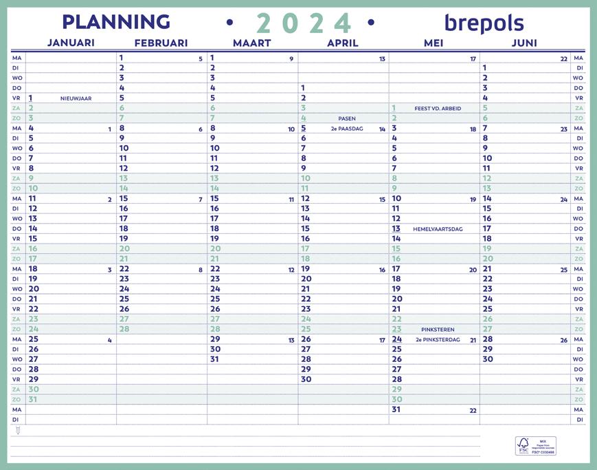 • Brepols overzichtelijke driemaandskalender op formaat 30 x 60 cm in 4 talen (NL-F-D-EN) met achteraan een jaaroverzicht. De kalender is voorzien van een handige datumaanwijzer, vermelding van feestdagen en de weekenden zijn direct herkenbaar. Gevouwen geleverd.
