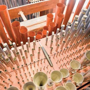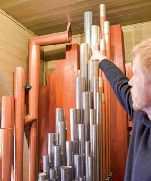 Der er skåret i hver pibetop og rullet en stribe metal nedad – som en gammeldags konservesdåse, der er blevet åbnet med en dåseåbner. Bredden og længden på disse metalruller har betydning for lyden, og det er kun uddannede orgelbyggere, der kan stemme dem, da det kræver millimeterpræcist arbejde at tilpasse dem på den helt rigtige måde. Til gengæld er der også lange rækker af en anden slags kobberpiber, der er monteret på en træsokkel, der ligner et træben. De stemmes via et tyndt rørblad, som går ned i træsoklen, og dem kan Erik Kolind derfor selv stemme. Inde i selve orglet ved siden af disse piber er der nemlig en slags genvejstaster til orgeltangenterne. Så han kan spille selve tonen, mens han justerer