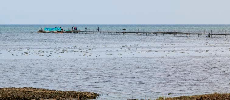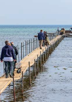 Søvangs helt eget sjak af frivillige brobisser var sidste weekend på hårdt arbejde med at sætte den imponerende 279,1 meter lange badebro op. Undervejs i arbejdet opstod der nogle ekstra udfordringer for de frivillige brobisser. Efterårets storme havde nemlig skabt ændringer i havbunden. Bundforholdene gav nogle forsinkelser, og årets broarbejde kunne derfor først afsluttes om søndagen. Søvangs badebro, der har ligget samme sted siden 1929, bliver benyttet flittigt hver sommer – og så er den endda også kendt ud over kommunens grænser: I 1997 blev badebroen optaget i Guinness Rekordbog som værende Danmarks længste, og desuden har den været med i den danske film »Ved Kongelunden« fra 1953, hvori man ser de to hedengangne skuespillere Dirch Passer og Ove Sprogøe gå ud på broen en dejlig sommerdag. Broen vil blive taget op på land i slutningen af september måned – igen med hjælp fra Søvangs brobisser. TM