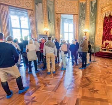 rede med sin smukke interiør og historiske detaljer. Kulturformidler Kamusa Lise Ortiz gav gruppen et levende indblik i rummenes betydning, men hun måtte med et smil indrømme, at hun ikke kunne præcisere, hvilket rum kongen eller dronningen brugte til modtagelser, da de ofte skifter værelse. Før deltagerne fik adgang til lokalerne, blev de iført blå beskyttelsessko for at beskytte de værdifulde gulve. Kamusa Lise Ortiz fremhævede også de unikke gulve og lofter, der hver især er små kunstværker. Turen gennem slottet kulminerede i gobelinsalen, hvor Bjørn Nørgaards kendte gobeliner skildrer Danmarks kongerække med en humoristisk og kunstnerisk vinkel. Bjørn Nørgaard fik frie hænder af dronning Margrethe til at skabe værket, som også inkluderer ham selv og hans hest.