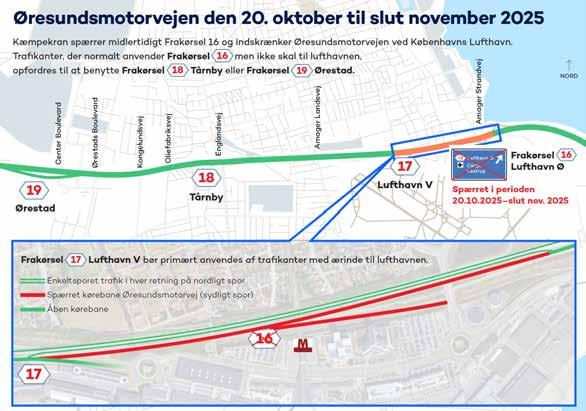 Arbejdet betyder, at frakørsel 16 –Lufthavn Ø – bliver delvist spærret af kranen. Der vil kun være ét farbart spor mellem frakørsel 16 og 17, og derfor anbefaler Sund & Bælt, at trafikanter, der ikke skal til luthavnen, benytter frakørsel 18 ved Englandsvej i Tårnby eller afkørsel 19 i Ørestad.