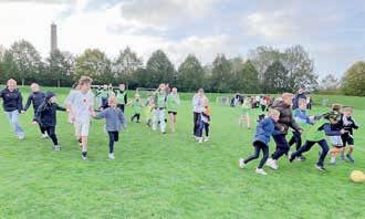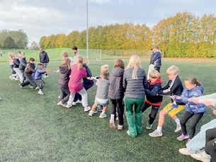 Her ses store og mindre elever sammen, mens de konkurrerer i hold på tværs af årgange. »Hele skolen emmer af grin og latter og god energi. Motionsdag er bare så skønt,« lød det fra afdelingsleder Signe Schandorff på Store Magleby Skole. Foto: Store Magleby Skole