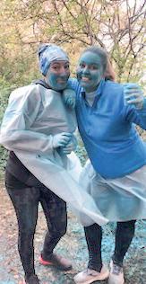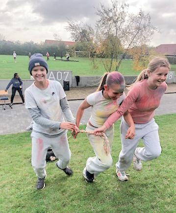 Det er altid helt frivilligt, om man vil have kastet farvepulver på sig. Men langt de fleste elever kunne slet ikke få nok farver og bad selv om at få det på tøjet, i håret og i ansigtet. Der gik nemlig konkurrence i, hvor meget farve, man havde på sig, fordi det jo tydeligt viste, at man havde løbet mange runder. Foto: Nordstrandskolen