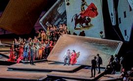 Optagelsen af den franske komponists mest succesrige opera blev opført på verdens største, spektakulære fly dende scene ved Bodensøen i Bregenz, med et sæt desig net af den britiske kunstner Es Devlin i samarbejde med den danske instruktør Kasper Holten.