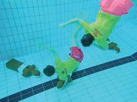 heller ikke risiko for, at en bi kini smuttede af midt i aktivi teterne. Det viste sig at være en rigtig god idé, fortæller Tanya Ingwes, der oplevede, at det gav ro til at deltage i øvelserne og dyste mod hinanden på red ningsboards.