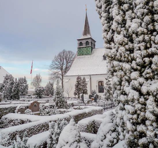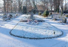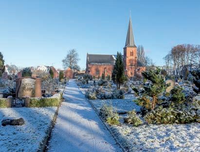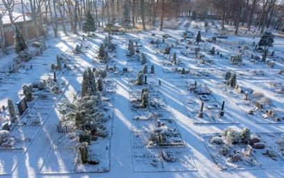 Dragør Kirkegård fremstår smuk og harmonisk denne vinterformiddag, hvor solen skinner over et let snedække.