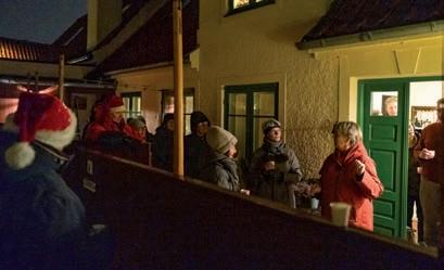 Fredag den 23. december Lillejuleaftensdag den 23. december var det igen fint vejr – og 50–60 personer gik til Lodsstræde 9, hvor Helle Søndergaard og Lars Holmegaard tog imod og fortalte en spændende historie om deres hus. Under udgravning af stuegulvet var de cirka 80 cm nede stødt på et fint flisegulv. Derfor begyndte parret også at grave i historien og fandt, at huset havde været bageri i perioden 1923–1956. Der kunne fremlægges flere beviser, idet byggetilladelse til bageriet fra 1923 og tilladelsen til af have bageri på ejendommen kunne fremlægges i kopi. Flisegulvet blev bevaret og rummet under gulvet har nu en rigtig fornuftig funktion – det fungerer nemlig som vinkælder. Julevinduet var et rigtigt bagervindue – lige til at spise. Efter den spændende og
