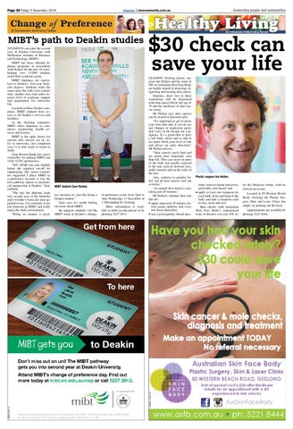 $30 check can save your life LEADING Geelong plastic surgeon Ian Holten and his team of GPs at Australian Skin Face Body are highly trained in detecting, diagnosing and treating skin cancer. Statistics show two in three Australians will be diagnosed with skin cancer before the age of 70 and the incidence of skin cancer rising. Mr Holten says skin cancers can be treated if detected early. âItâs important to get to know your own skin and, if you do see any changes or suspicious spots, donât rely on Dr Google for a diagnosis. Itâs a good idea to have a full body check and to talk to an expert about your level of risk and advice on early detection,â Mr Holten advises. âSkin cancers rarely hurt and are much more frequently seen than felt. They can occur on parts of the body not usually exposed to the sun, such as between toes, under toenails and on the soles of the feet. Also, contrary to popular belief, not all skin cancers start out as moles.â âAn annual skin check is easy, taking just 20 minutes.â Mr Holtenâs summer skin care tips are: apply sunscreen 20 minutes before going outdoors and every two hours thereafter; use a good-quality, broad-spec-