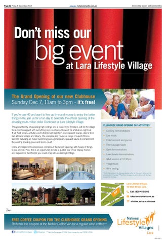 Sunday Dec 7, 11am to 3pm - It’s free! If you’re over 45 and want to free up time and money to enjoy the better things in life, join us for a fun day to celebrate the official opening of the amazing multi-million dollar Clubhouse at Lara Lifestyle Village. This grand facility, showcasing high ceilings and a rustic stone fireplace, will be the village focal-point equipped with everything one could possibly need for a fabulous night out. It will host shows, activities and Lifestyler get-togethers in an opulent lounge, dance floor, bar, alfresco terrace and library. The complex also houses a range of superb fitness facilities including an indoor swimming pool, gymnasium, spa and sauna to complement the existing bowling green and tennis court. Come and explore this impressive complex at the Grand Opening, with heaps of things to see and do. Plus, this is an opportunity to take a guided tour of our display homes and experience the lifestyle you could enjoy at Lara Lifestyle Village.