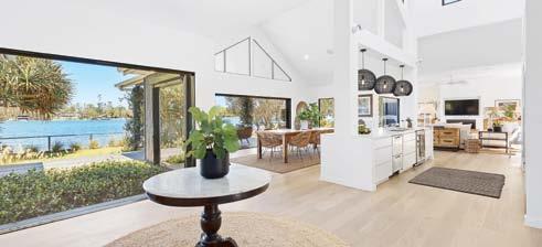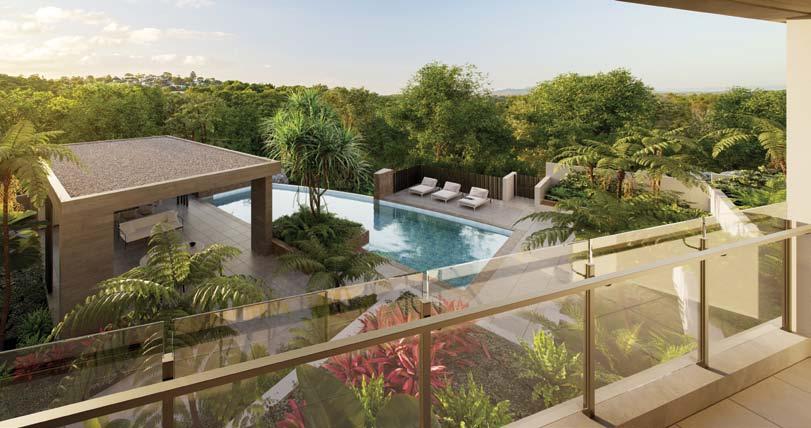 picturewindows,andhowbrightlightsaturatesthe expansivehallwayandopenleisurespaceontheright. Beyondisanover-generousopenplanlivingarea. Doors‘disappear’seamlesslyconnectingtothedark bluepoolwithtravertinesurround-centredinthe courtyard.Similarly,doorsopenontheothersidetoa terraceandbackdropoffencedgardenfringedwith brightheliconias.