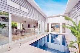 Beyond is a spacious open-plan living area that seamlessly connects to the dark blue pool centred in the courtyard.