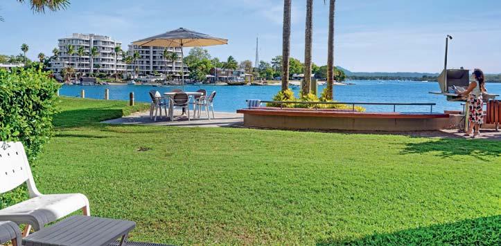 muchmoretothe180-degreesurrounds.Adjoiningthe lawnistheiridescentwhite-sandandturquoise waterofNoosaRiverforeshore.Itstretchesfrom theneighbouringparktothenortherlyborderofthe CulgoaPointBeachResort.