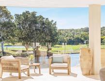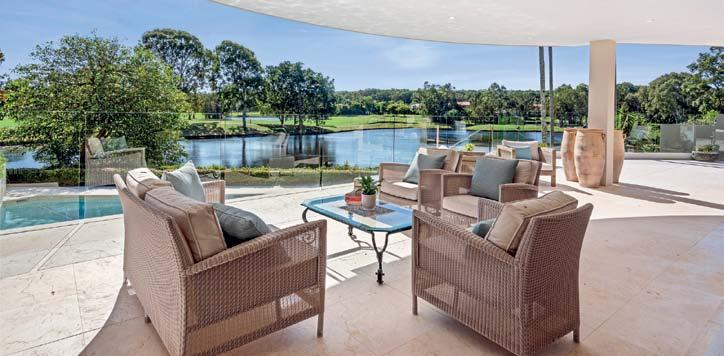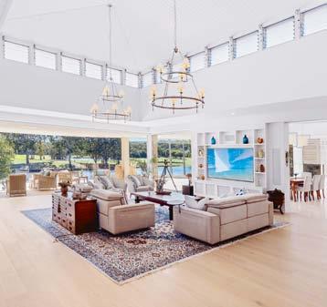 thevoluminousspacesaredrenchedwithdappled naturallightthankstosurroundingclerestorywindows, cofferedceilingsandnorth-facingglasspanelswhich disappearinaseamlessfashiontothealfrescoterraces. Theglisteningpoolandlowerpartoftheterrace ostensiblyhoveroverthelily-paddedlakeseparating theresidencefromthe17thfairwayandbeyond. Doubleeaglebeforelunchanyone?