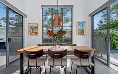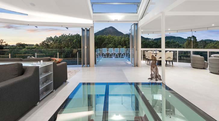 Insidebetotallyentrancedbytheliberaluseofceiling to floorglass.Itextendsthewidthoftheresidenceand halfwayitostensiblydisappears,morphingindoors tooutdoors,revealingamassiveundercoverterrace. Itexpandstotheluminescentpool,invitesthose quintessentialbrilliantblueoceanviewsandgivesthe impressionofhoveringabovethetrees.