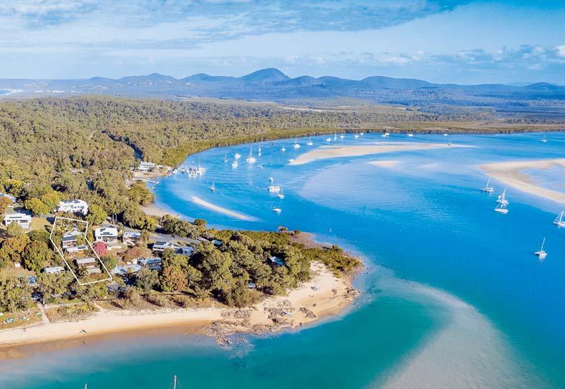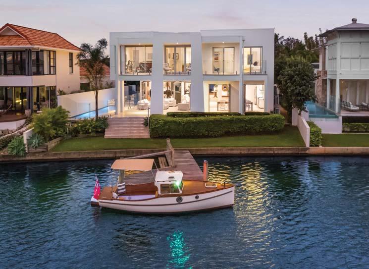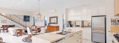 beguiles,whilstexemplifyingthemagicaloutdoors.Sets ofslide-awaywhiteshuttersandglassdoorscoalesces totheprivatenorth-facingundercoverterrace,thus articulatingthesuperlativeposition.Lawn,dottedwith exoticfoxtailpalmsextendstothetidalbeachandlong jetty/pontoon.Sundownersanyone?
