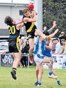 Main: Luke Davis leaps high to mark. Left: Nathan Mifsud snaps a goal for Torquay. Centre: Charlie Ham flies high in a marking attempt.