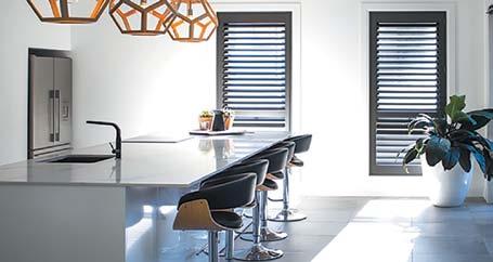 There are modern white plantation shutters on all windows downstairs and on the large glass entry door and adjacent windows.