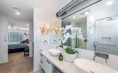 The king bedroom suite, also on this level, has custom day bed, louvres to take advantage of the views, VJ custom bedhead, wall of built-in robes and a large ensuite with walk-in shower, white stone-topped cabinetry and floor-to-ceiling travertine.