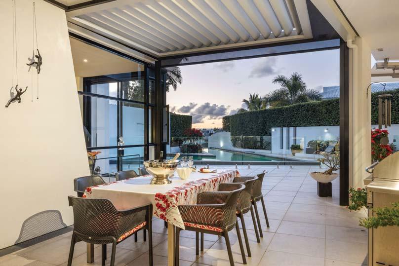 and reasons.Checkoutthesuperhigh ceiling, wallof louvresandbankofdisappearingdoorsmaximizing naturallightwhichseeminglydancesacrossthe travertine flooringandmeldseffortlesslywiththe alfresco nucleusoftheresidence,albeitthewide undercoverterraceadjoiningthelustrouspool.