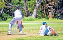 Right: Geelong West’s Gautham Sathikumar (16 runs) pulls this ball to mid-wicket and is caught.