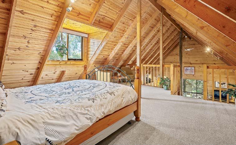 Inside, the heart of the home is the open-plan kitchen, dining, and living area where soaring timber ceilings and a woodfire add warmth and charm. The kitchen is both practical and stylish, with floating floors, freestanding oven with gas cooktop, island bench, dishwasher, corner pantry, and leafy garden views. Ducted heating runs throughout for year-round comfort.