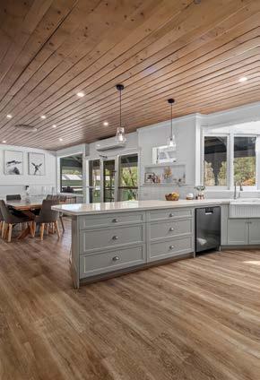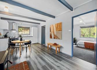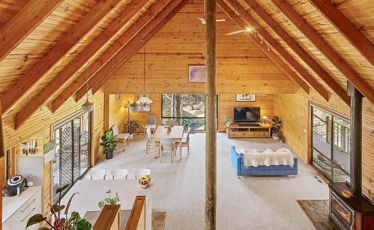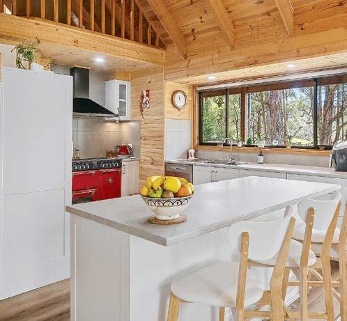 Inside, the heart of the home is the open-plan kitchen, dining, and living area where soaring timber ceilings and a woodfire add warmth and charm. The kitchen is both practical and stylish, with floating floors, freestanding oven with gas cooktop, island bench, dishwasher, corner pantry, and leafy garden views. Ducted heating runs throughout for year-round comfort.