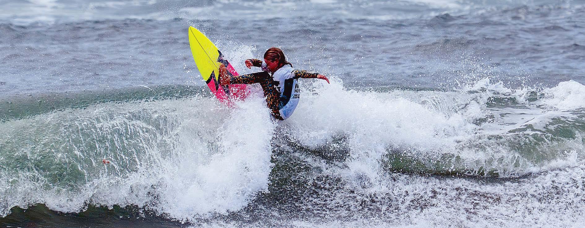 Surfing in his first nationally-ranked junior event, Levi Vosloo (Barwon Heads) took to the challenging conditions with ease,scoringatotalof16.66outofapossible 20 in the under 14 boys final.