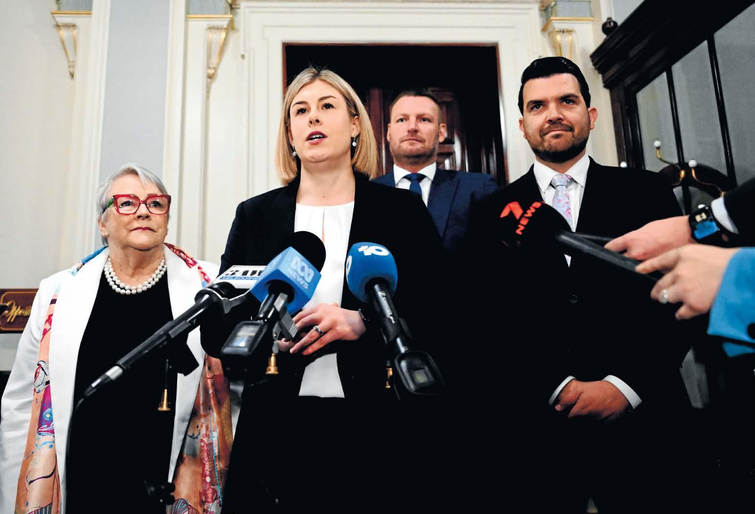 “This morning, the Liberal party room elected me as parliamentary leader unopposed, and I congratulate the team behind me,” Ms Wilson said outside the party room backed by MPs Sam Groth, Bev McArthur and Evan Mulholland, who were instrumental in electing Mr Battin as leader last year.