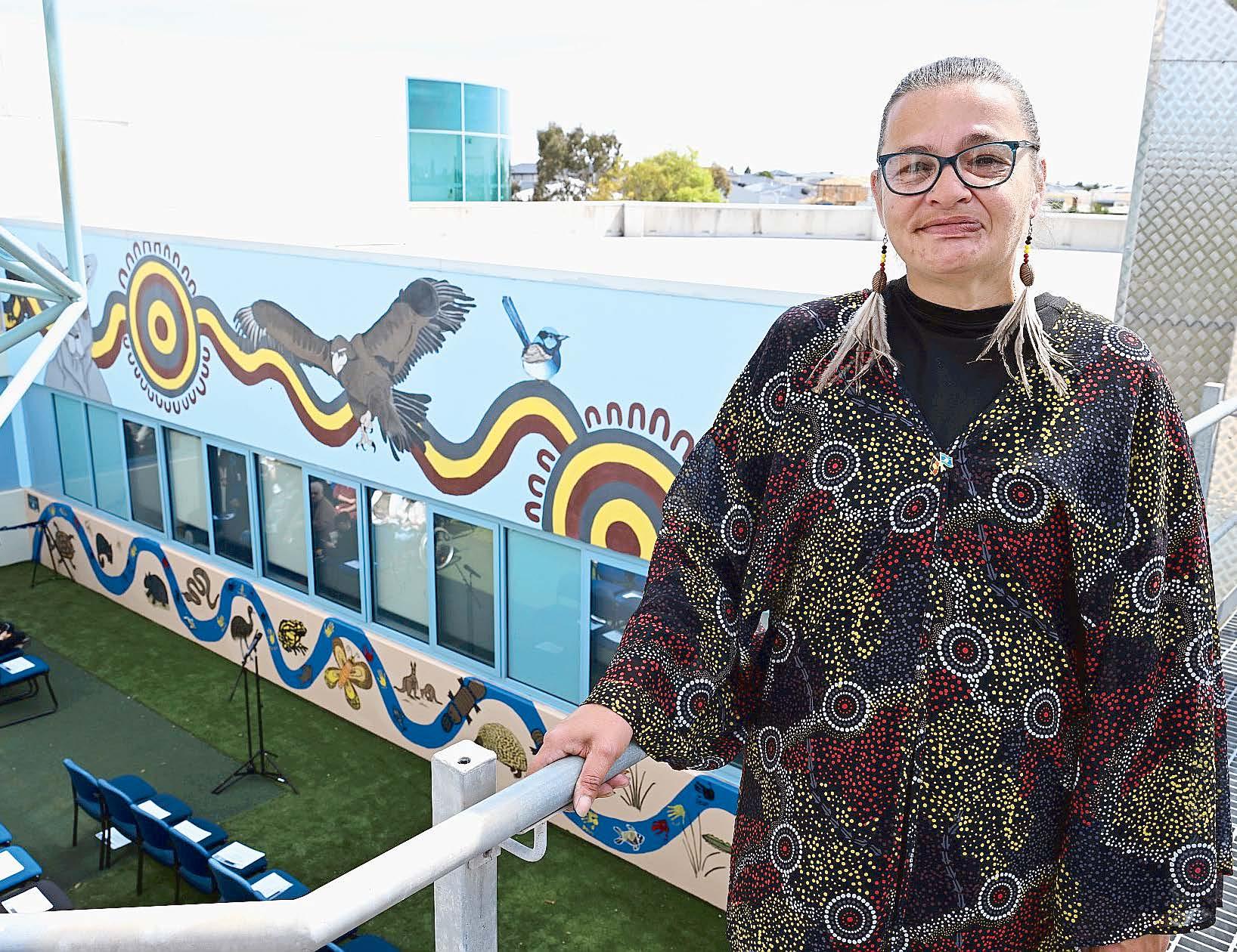 The mural has a top section that includes a crow, western grey kangaroo, wedge tail eagle, blue wren an emu, with a gathering circle in the middle.