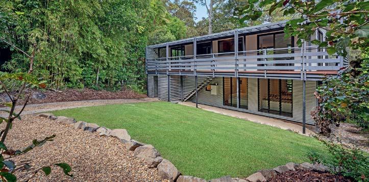 north-facing terracescleverlytakeprizedplacein thesun,whilst maximisingthenotionofinvitingitself indoorstoshadowdanceoverseeminglyendless brushbox flooring.The centre ofattractionisaneversohighvoidwithglass ceilingandbelow,balustrading withguitartensionerscreatively connected to the nauticallyinspiredcurvedwestern redcedar staircase.