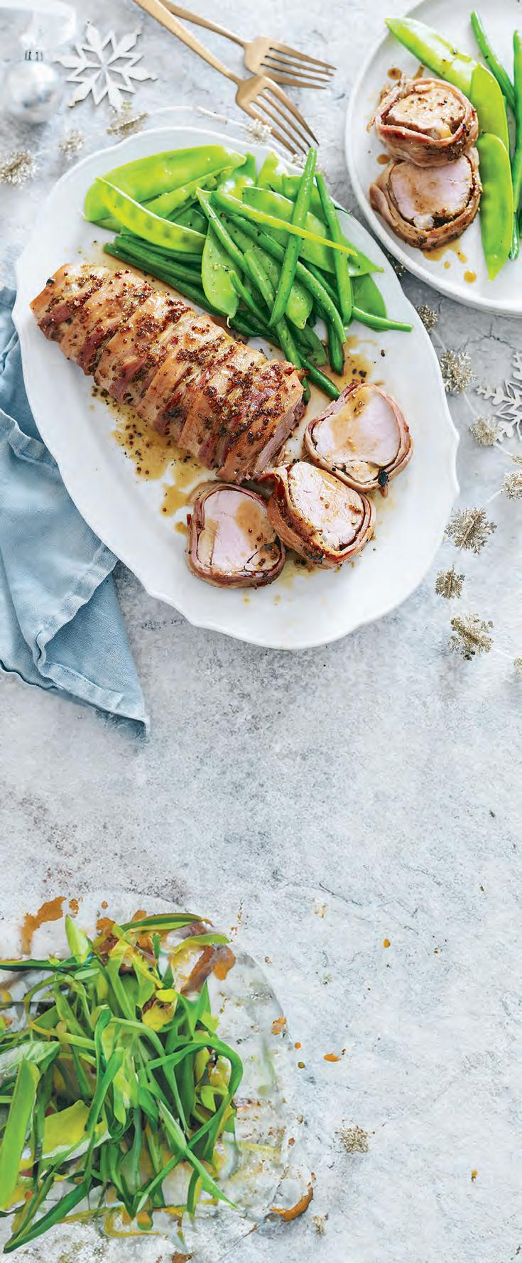 8. Place pork onto the bacon at one end. Wrap bacon over the pork to enclose it and form a neat roll.