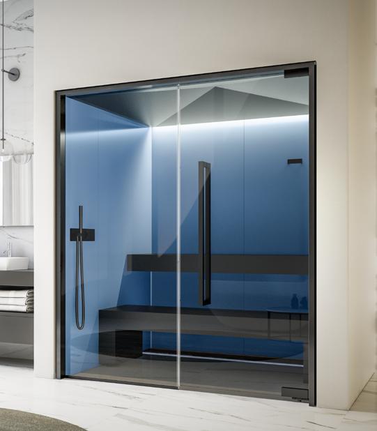 Soul Sauna in versione Blue Soul, con panche e soffitto in Black Soul. La maniglia richiama le cromie interne scelte