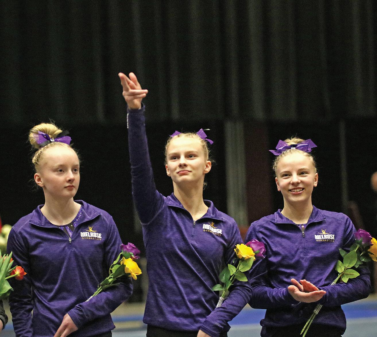 Josie Eveslage (center) salutes the audience as she and teammates Maria Hinnenkamp (left) and Courtney Althaus are introduced at the Minnesota State High School League Class A Girls Gymnastics State Meet Feb. 25 at Roy Wilkins Auditorium in St. Paul. Eveslage competed on the beam, Hinnenkamp on bars and Althaus as an all-around.