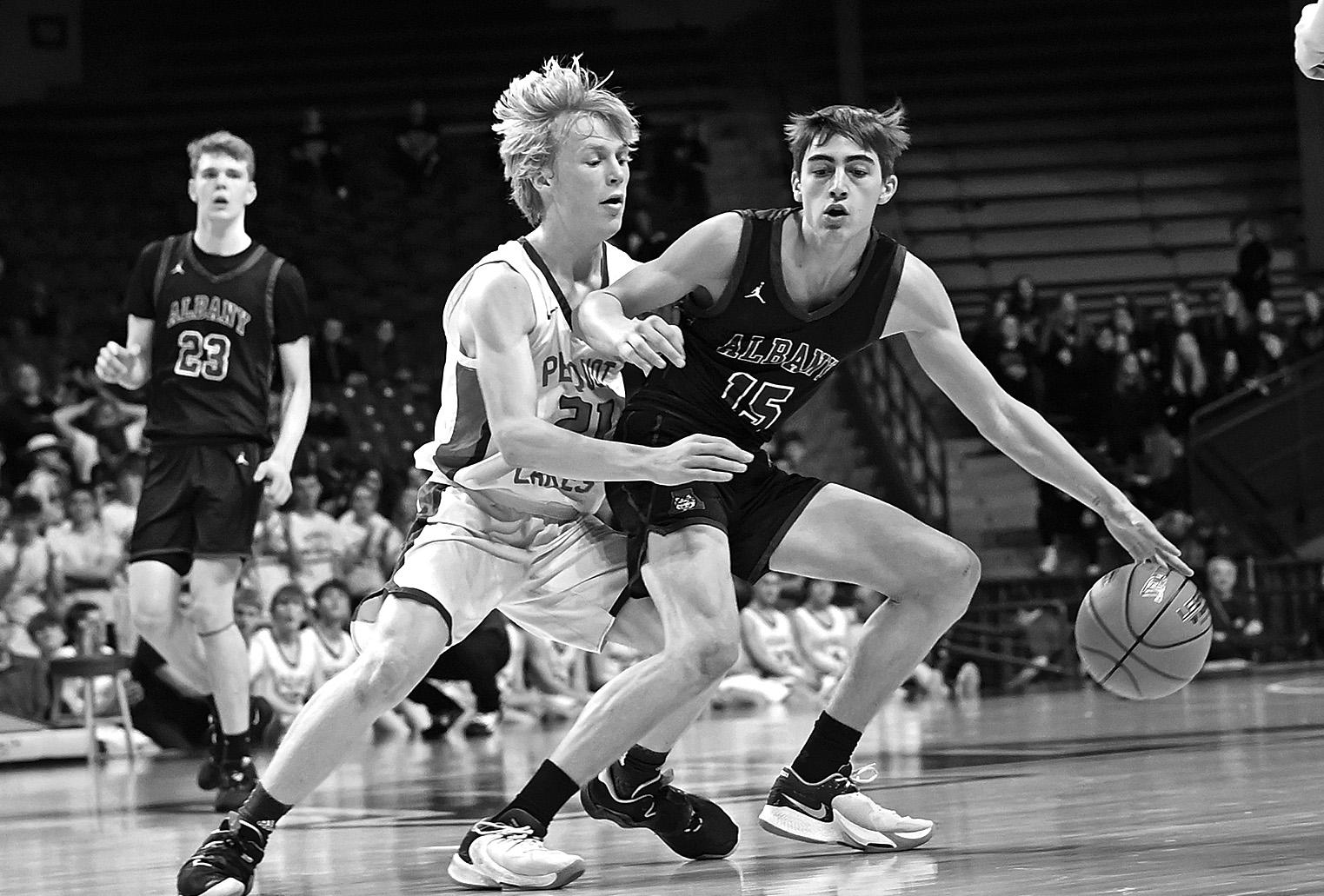 Albany’s Andrew Olson (right) stops during a dribble to avoid a Pequot Lakes defender March 21 at Williams Arena in Minneapolis. Olson and the Huskies advanced to the Minnesota State High School League Class AA Boys Basketball State Tournament semifinals against Dilworth-Glyndon-Felton.