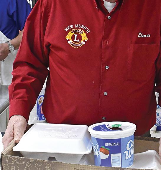 PHOTOS BY CAROL MOORMAN Lion Tom Neal visits with diners, including Diane and Don Kerfeld, as they go through the serving line during the March 5 New Munich Lions Breakfast at Immaculate Conception Catholic Church basement in New Munich. The Lions served more than 775 people.